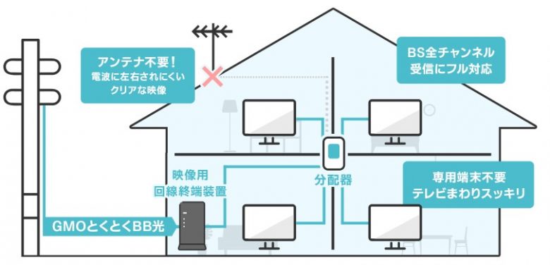 GMOひかりテレビは、アンテナの工事が不要で利用できます。接続には光回線を利用するため、アンテナがそもそも必要ないからです。