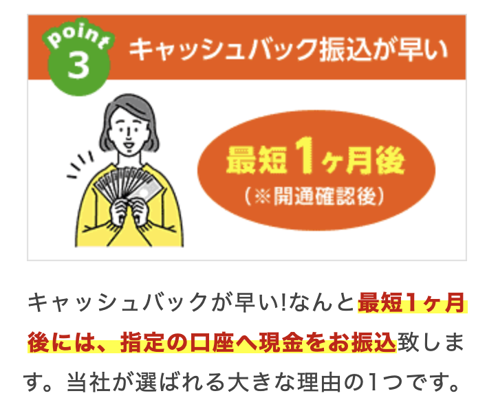 契約後すぐにキャッシュバックを受け取れるので、すぐに現金を手にすることもできます。