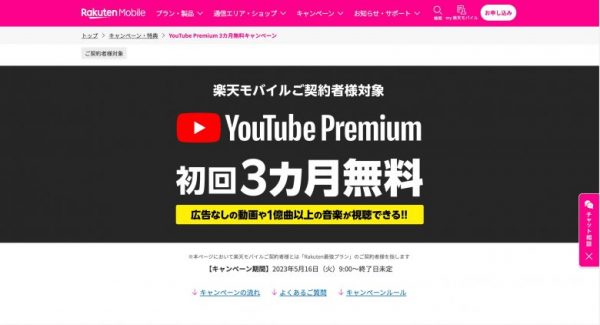 | YouTube Premium 3ヵ月無料キャンペーン | 広告なしでYouTube &YouTube Musicを楽しめる!バックグラウンド再生やオフライン環境で利用可能 | キャンペーン期間記載なし |