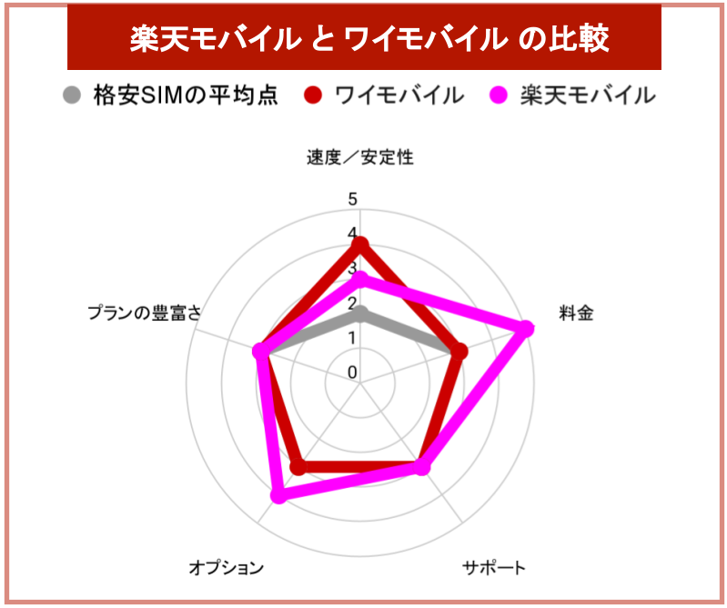 上記の5つをもとに楽天モバイルとワイモバイルの点数をグラフ化すると、以下のとおりです。