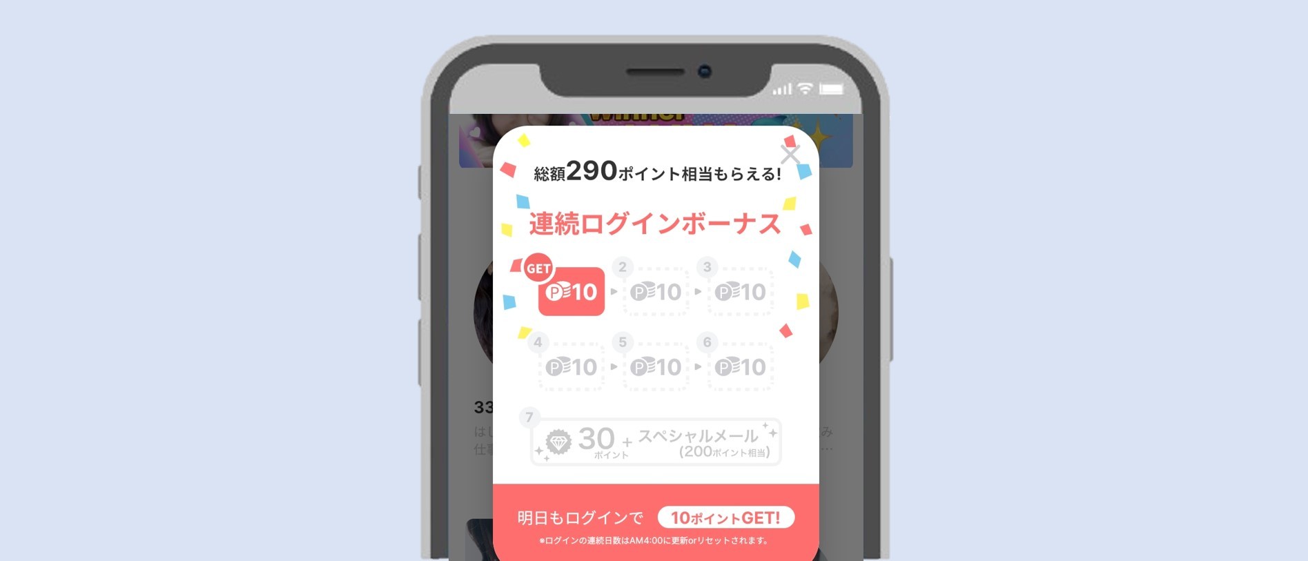 またハッピーメールは、登録時に最大1,200円分の無料ポイントが貰えます。他にもログインボーナスや友達紹介特典などで無料ポイントが多く貰えるため、コスパ重視の人におすすめです。